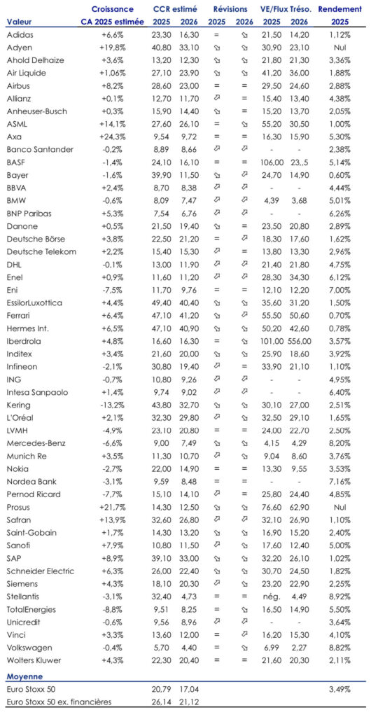 Dans notre calcul, il ressort ainsi que les grandes valeurs européennes se payent 20,79 fois leurs profits estimés pour 2025. En excluant les financières, qui affichent historiquement des CCR très inférieurs à la moyenne et qui sont sur-représentées (10 valeurs sur 50), le CCR moyen monte à 26,14 pour 2025 et ressort encore à 21,12 pour 2026.